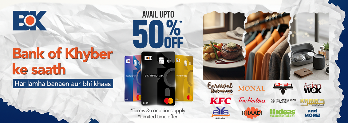 This is a nationwide discount campaign by Bank of Khyber (BoK) offering up to 50% discount on payments made using BoK Mastercard Debit Cards at selected restaurants, lifestyle, apparel, and electronics brands across Pakistan.